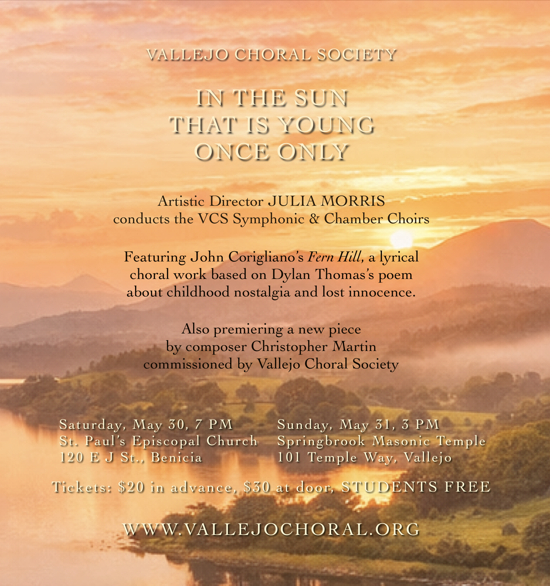 VALLEJO CHORAL SOCIETY presents our season finale concert IN THE SUN THAT IS YOUNG ONCE ONLY, conducted by Artistic Director Julia Morris.
